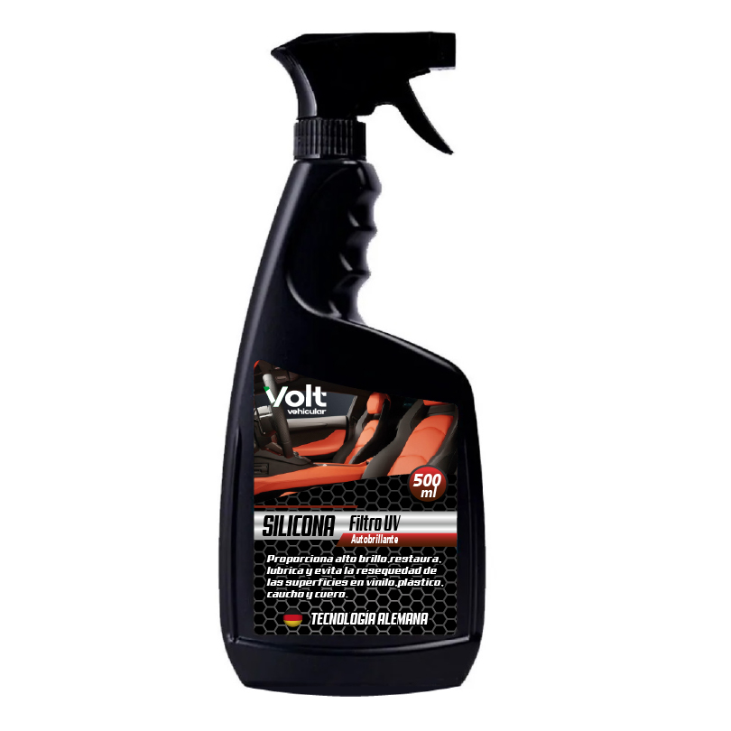 La silicona con filtro UV Volt se utiliza en el interior del vehículo, en superficies como vinilo, plástico, caucho y cuero, revitalizando el color original. No se deje llevar por productos grasosos o derivados del petróleo que pueden deteriorar las superficies del interior del vehículo.